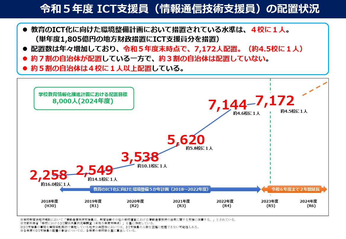 GIGAスクール構想前には2258人だったICT支援員が、令和5年度には7172人へと増加しました。4.5校に1人の配置となっています。目標は8000人、4校に1人の水準です。